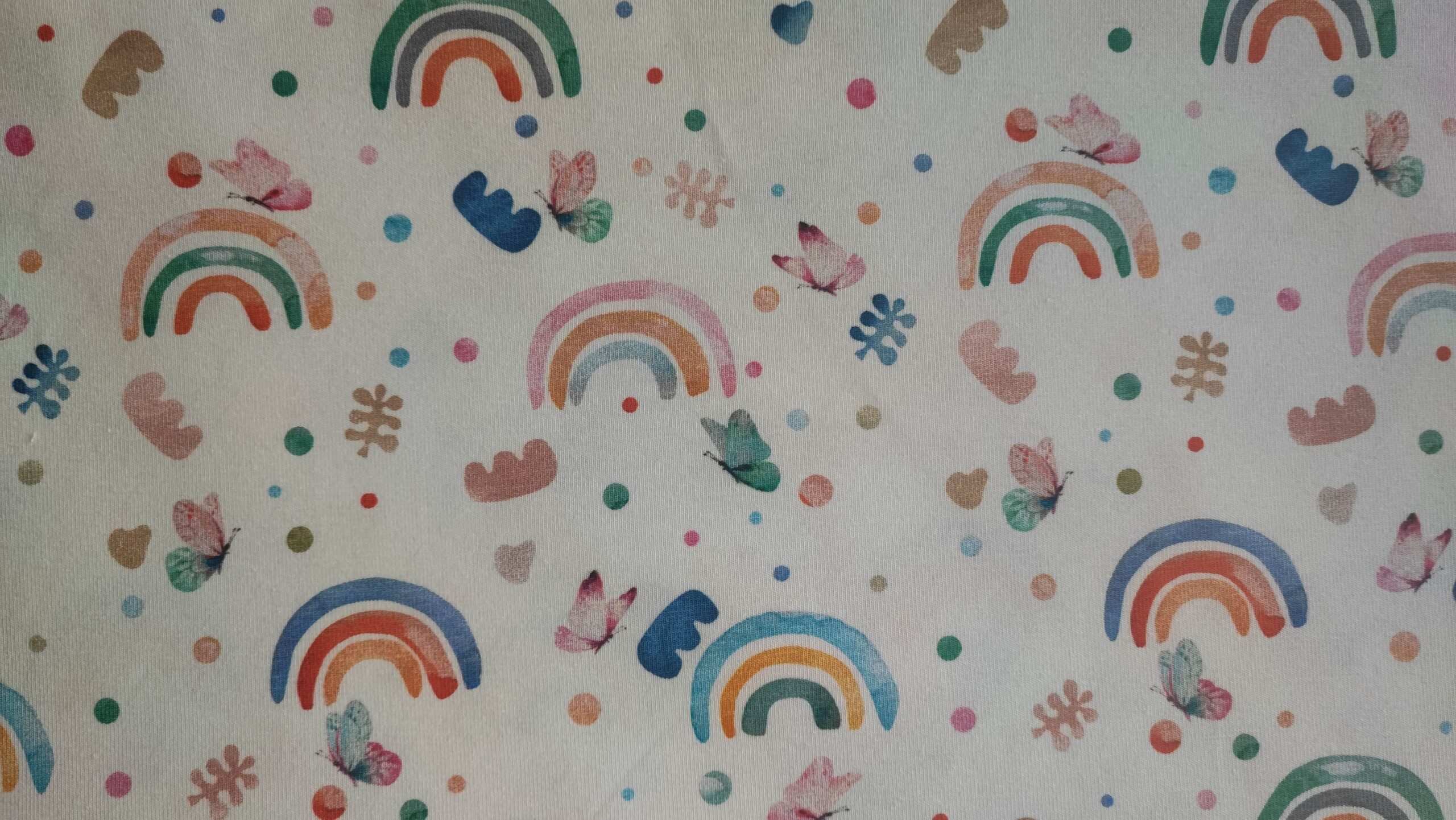 Szivárványos pillangós pamut jerseyElérhető: 4 méter készleten