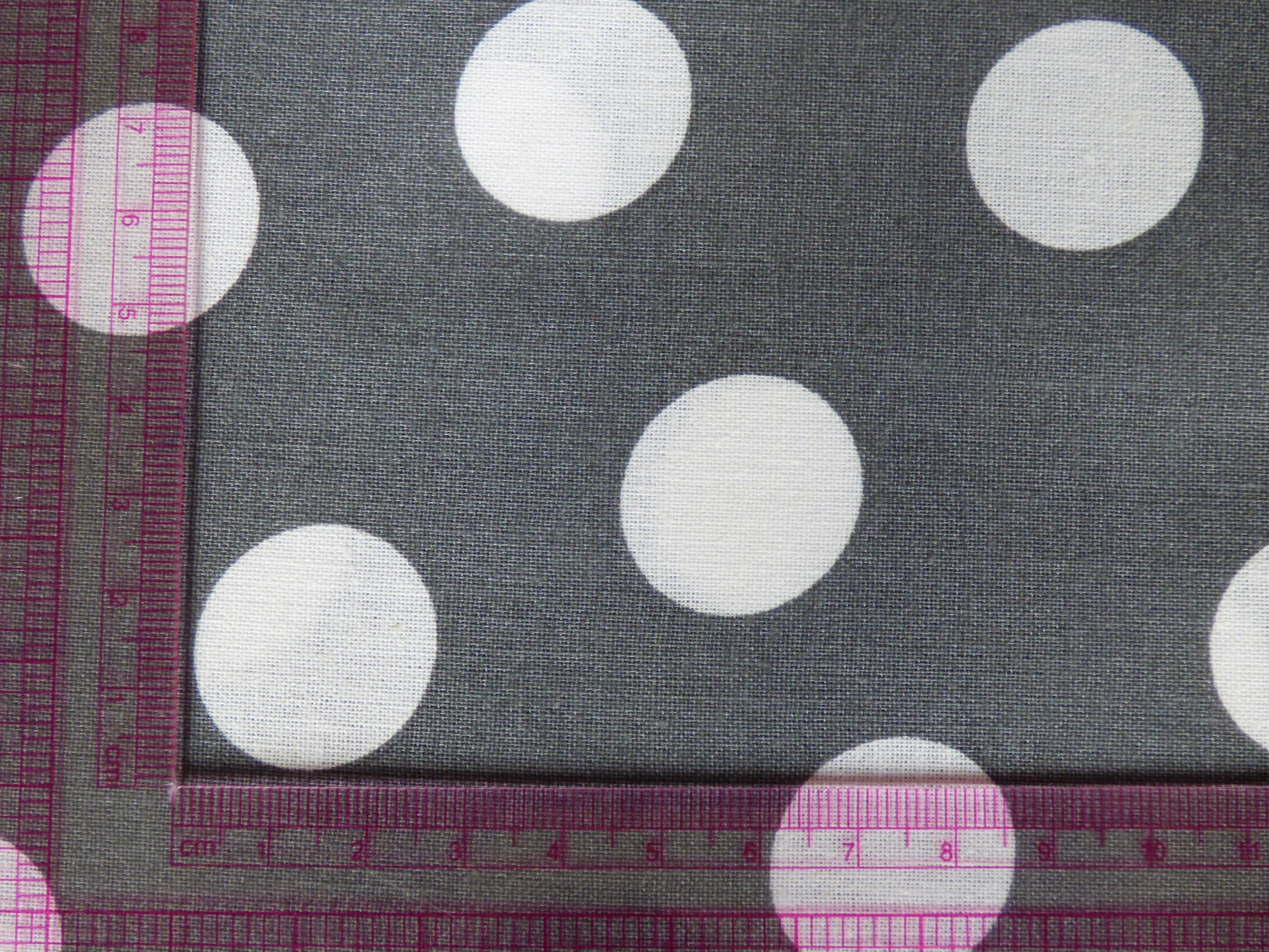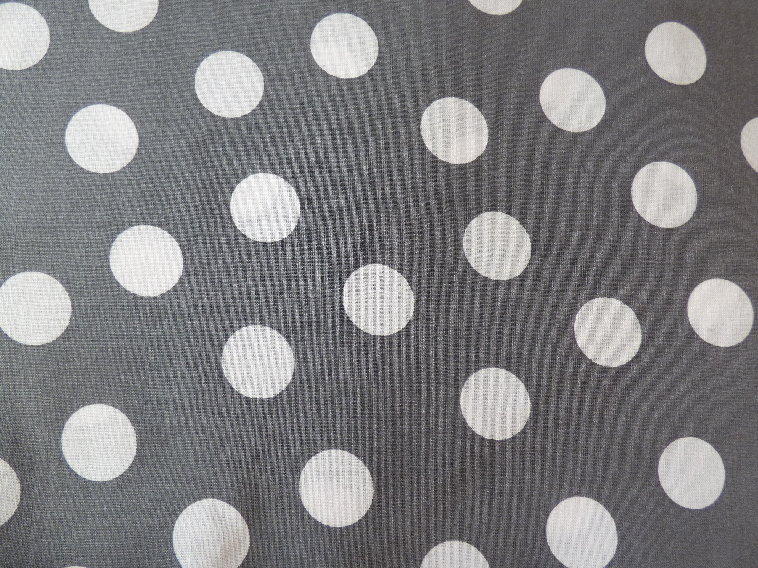 Szürke pamutvászon kb. 2 cm nagyságú fehér pöttyökkel. Alkalmas lakástextilek készítésére.