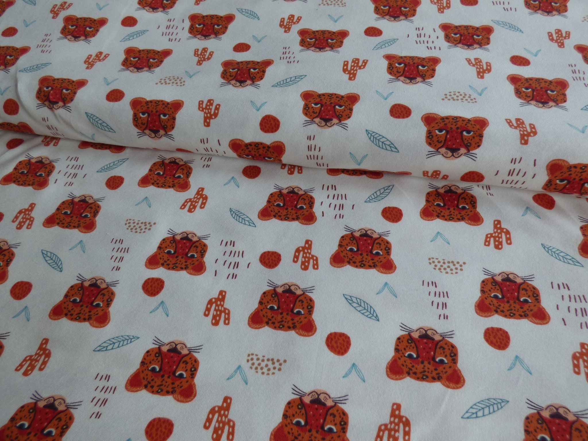 Tigris mintás pamut jersey anyag, lágyság és rugalmasság jellemezni. Készíthetünk belőle pólót, pizsamát, sapkát, babaruhát stb.